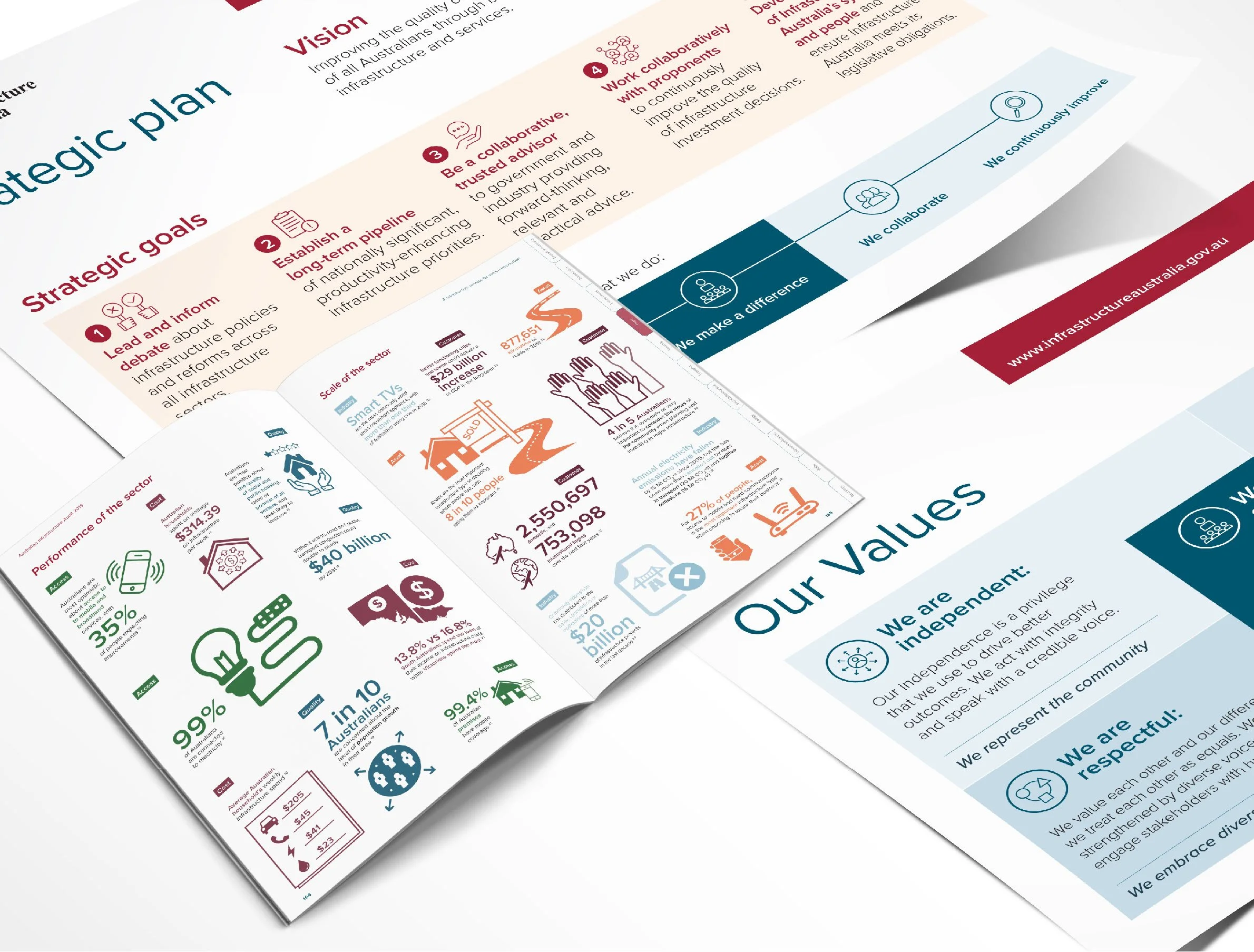 They provide independent research and advice on projects and reforms relating to investment in Australian infrastructure as to improve living standards and national productivity. Our work for IA has included a brand identity refresh with extensive brand guidelines and templates, as well as an abundance of reports that include detailed infographics, charts and maps.